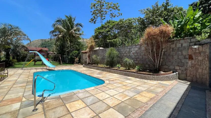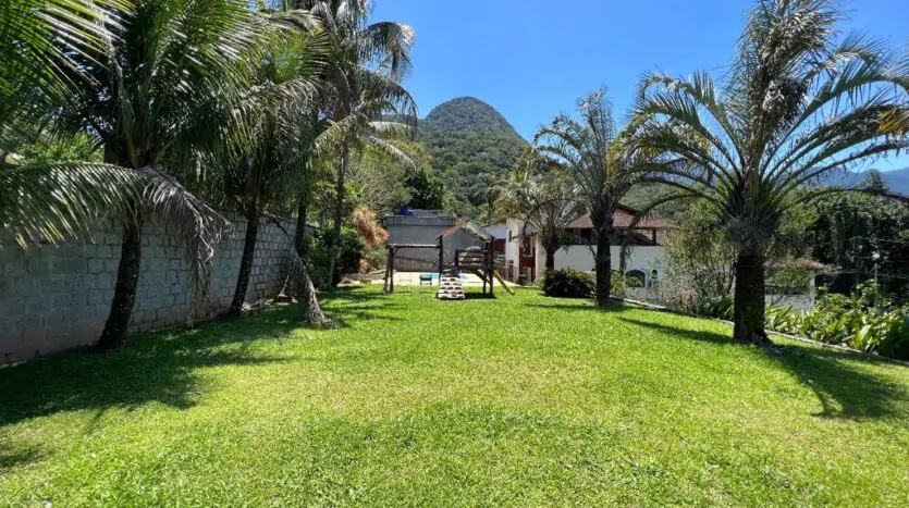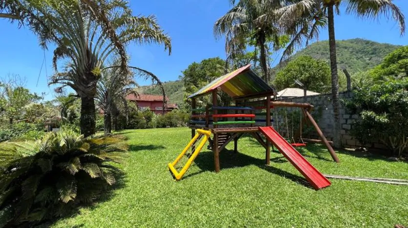 Área externa: Piscina, chuveirão, playground, jardim e um terreno gramado.