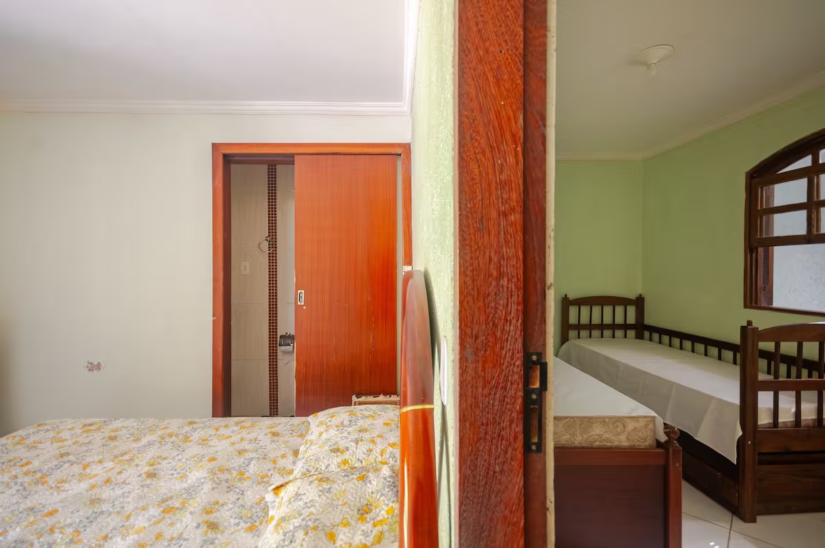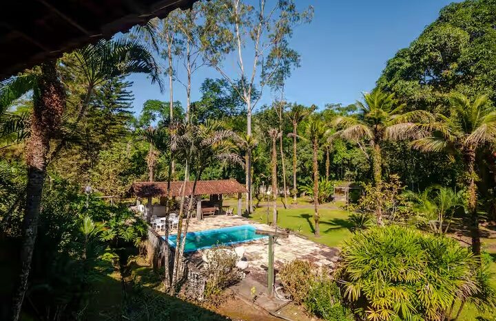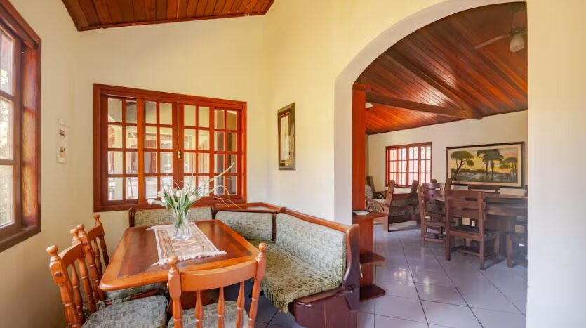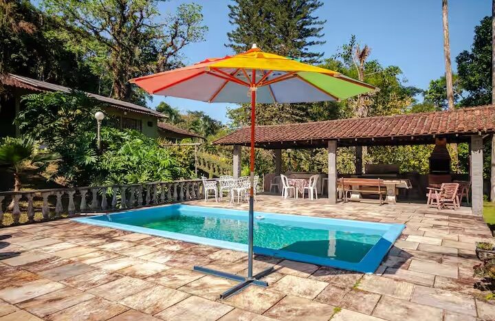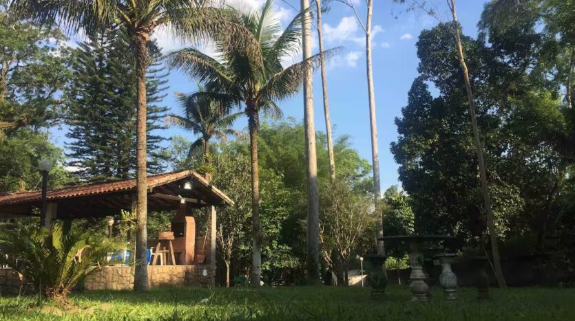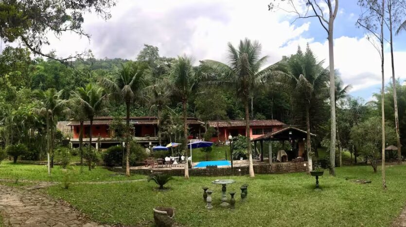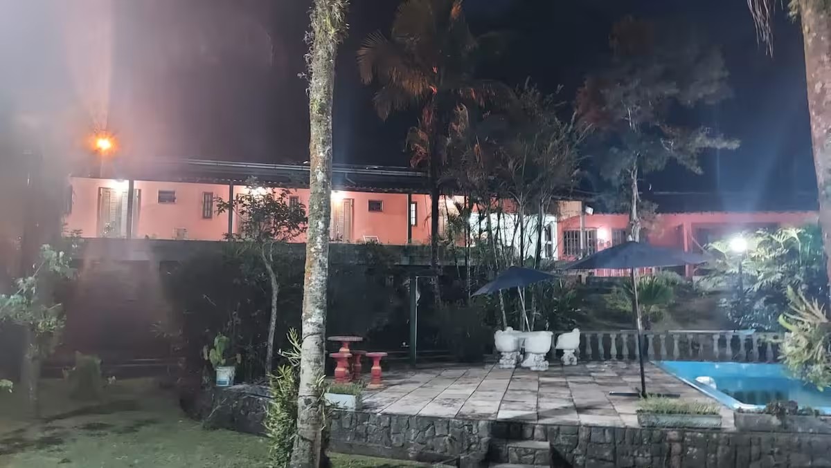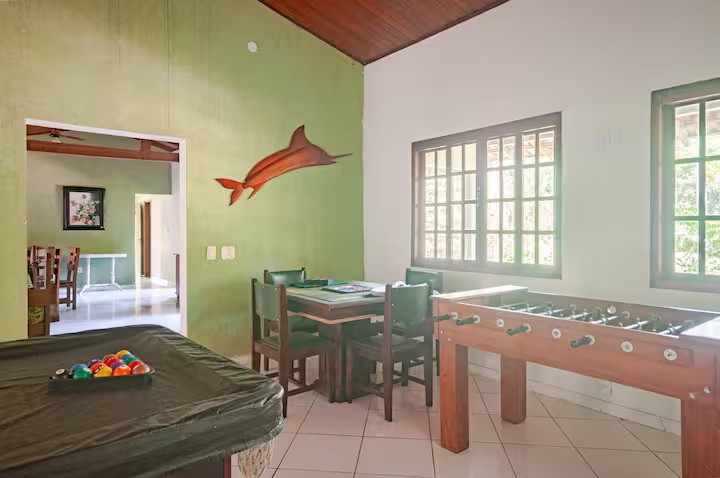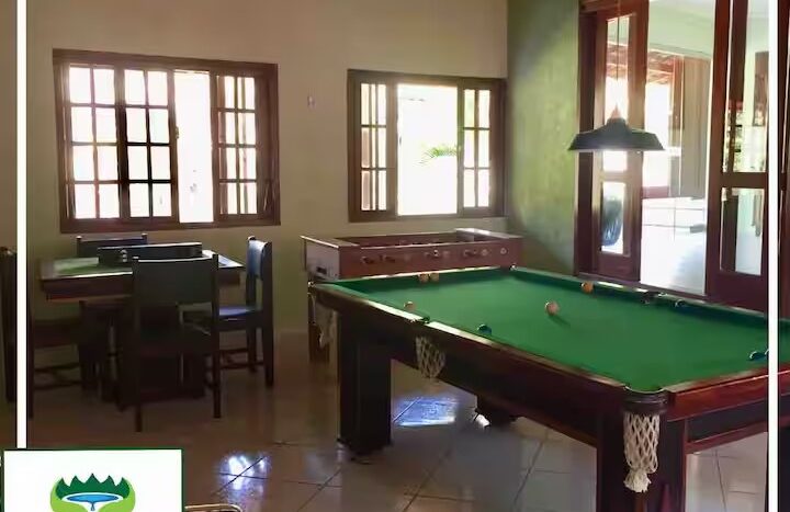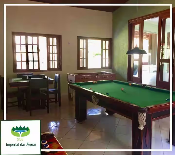 O Sítio conta com 8 quartos (sendo 4 suítes), 6 banheiros, sala de estar, sala de jantar, cozinha, varanda, sacada, salão de jogos com totó, sinuca…