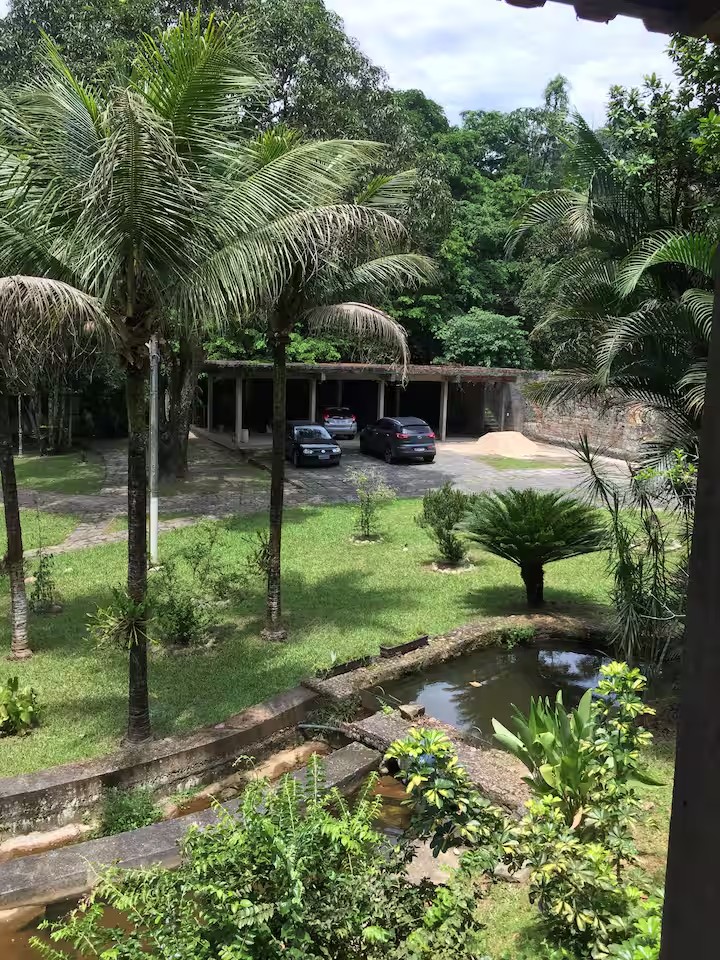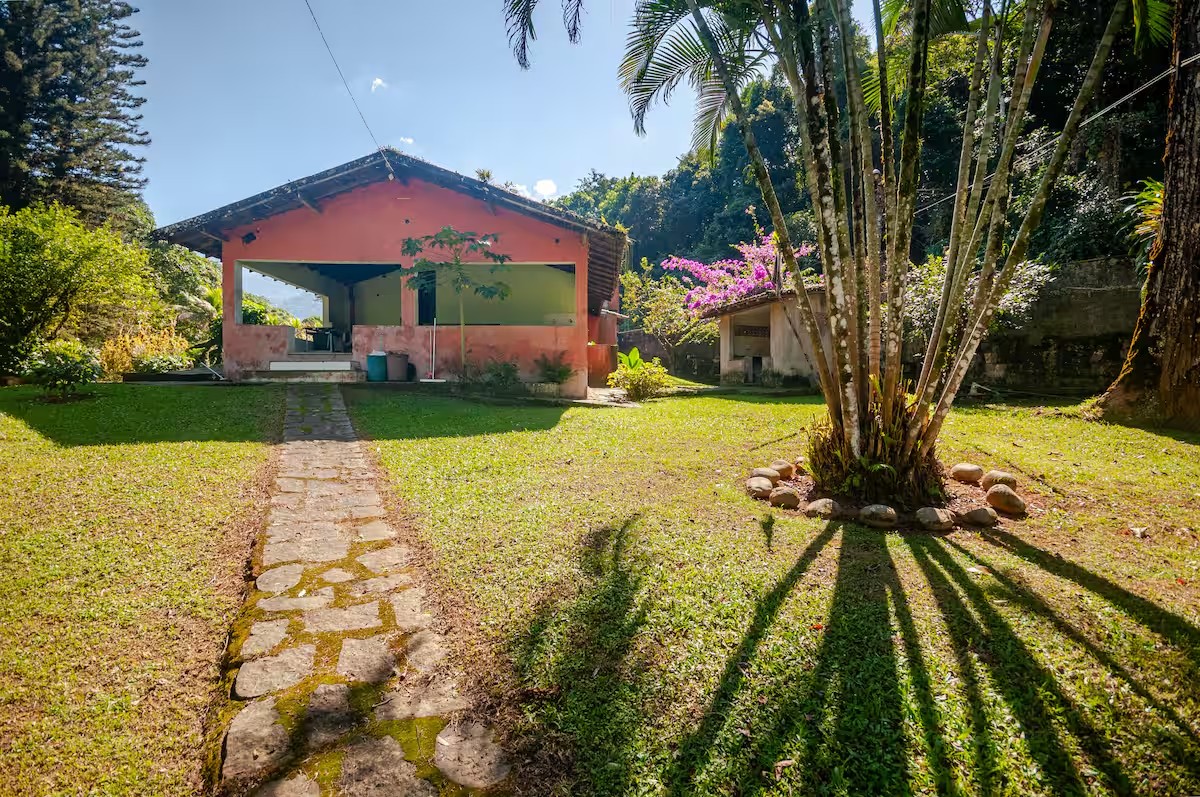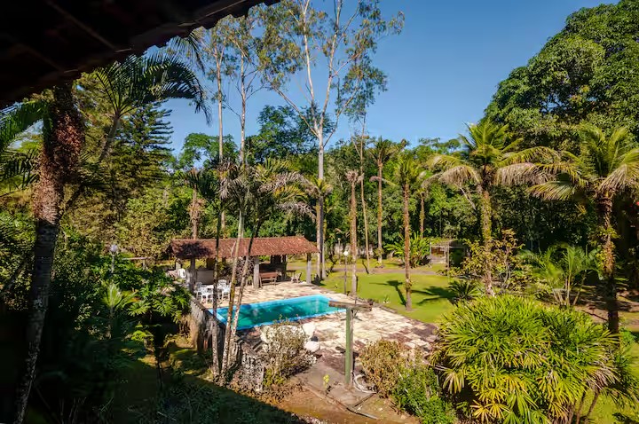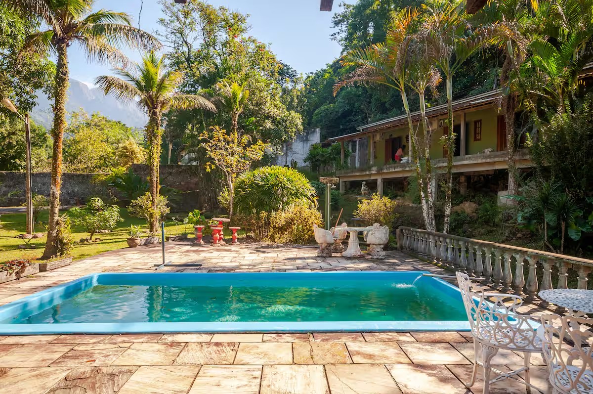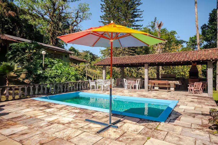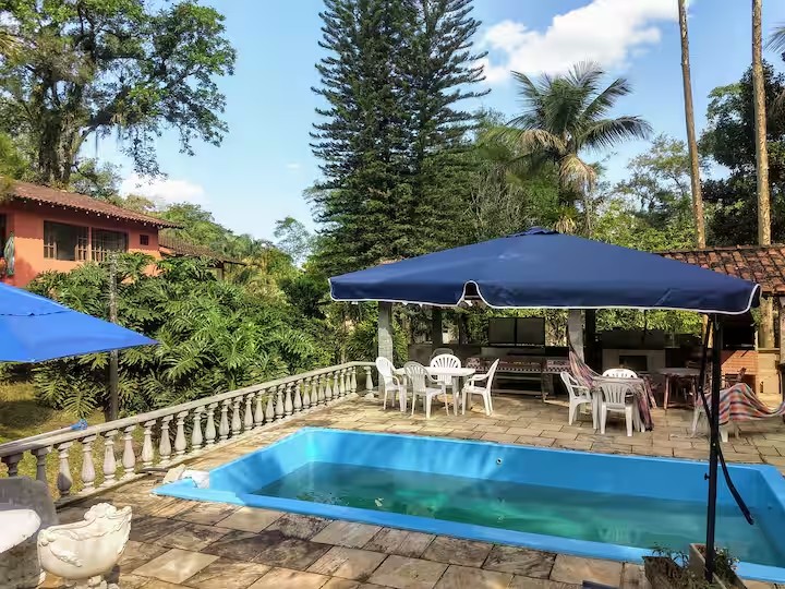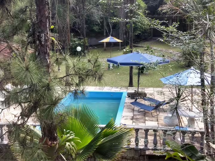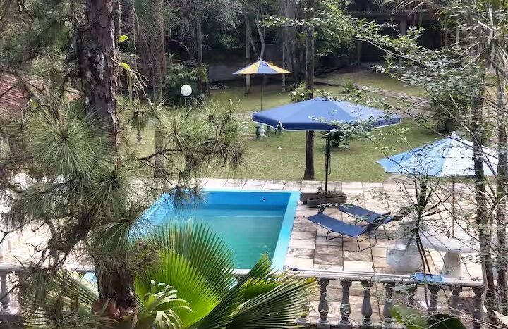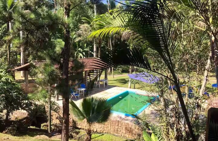Na parte de fora o imóvel posuui, piscina, edícula com churrasqueira, cachoeira ue passa nos fundos da propriedade, chafariz e bastante espaço para estacionar. Tudo isso com muito contato com áreas verdes, clima agradável e perto do Centro da cidade.